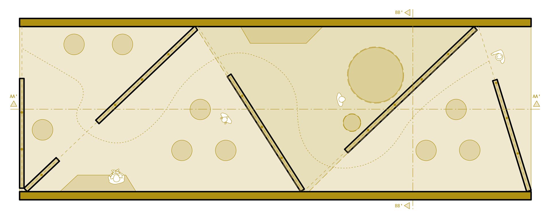 De ruimtelijke indeling laat zich omschrijven als een open, rustige en geometrische, waarbij de meeste werken centraal staan in de ruimte. Er zijn duidelijke looppaden, zodat bezoekers de kunstwerken van verschillende hoeken en afstanden kunnen benaderen.